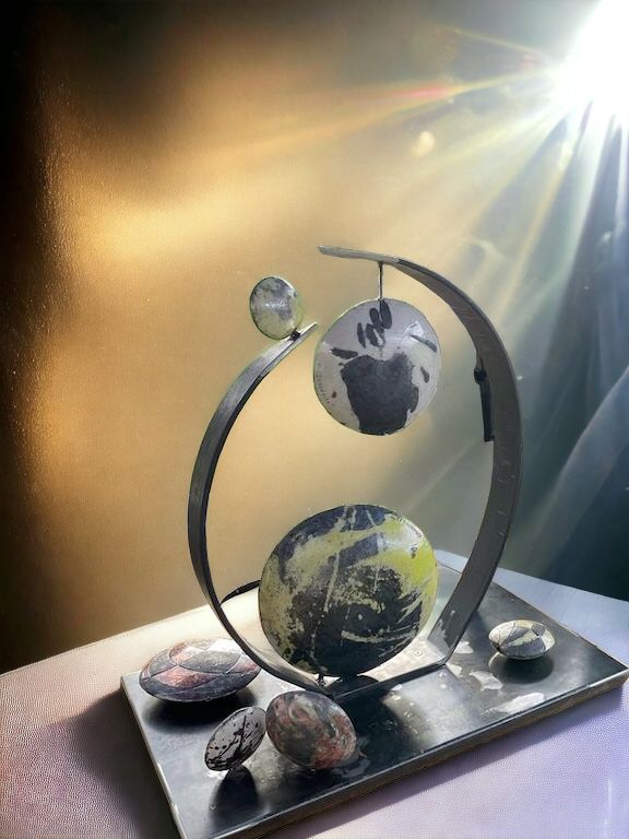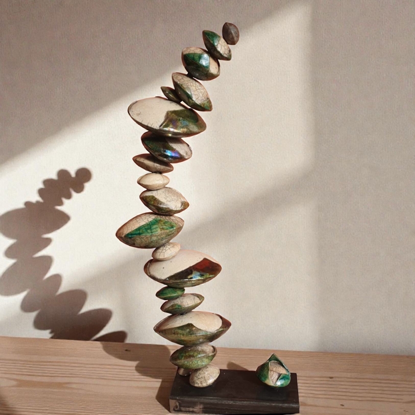 Martine Acquaviva, céramiste, explore la terre et le feu à travers la technique du raku. Formée aux Beaux-Arts de Paris, elle ouvre son atelier en 1984 et nourrit son œuvre de voyages en Afrique, en Pologne, Roumanie, Italie Maroc ou encore au Quèbec. Le cercle, symbole d’éternité, revient souvent dans ses créations modulaires, où l’équilibre et la matière dialoguent. Son travail mêle rigueur du geste et spontanéité de la cuisson, révélant la trace du feu et du temps. Chaque sculpture devient un voyage, une méditation sur la forme et la transformation.