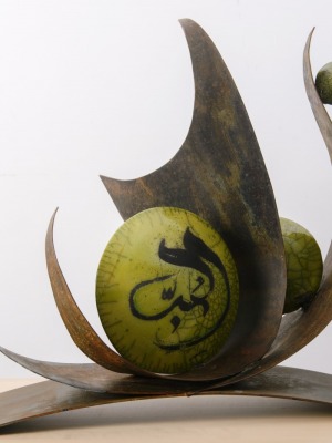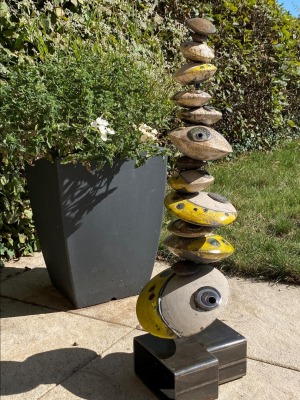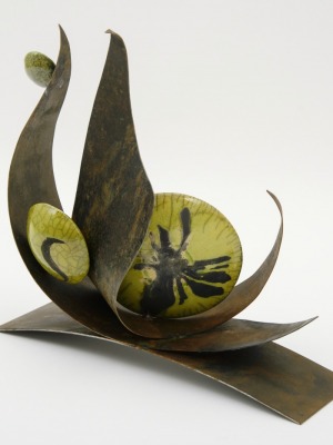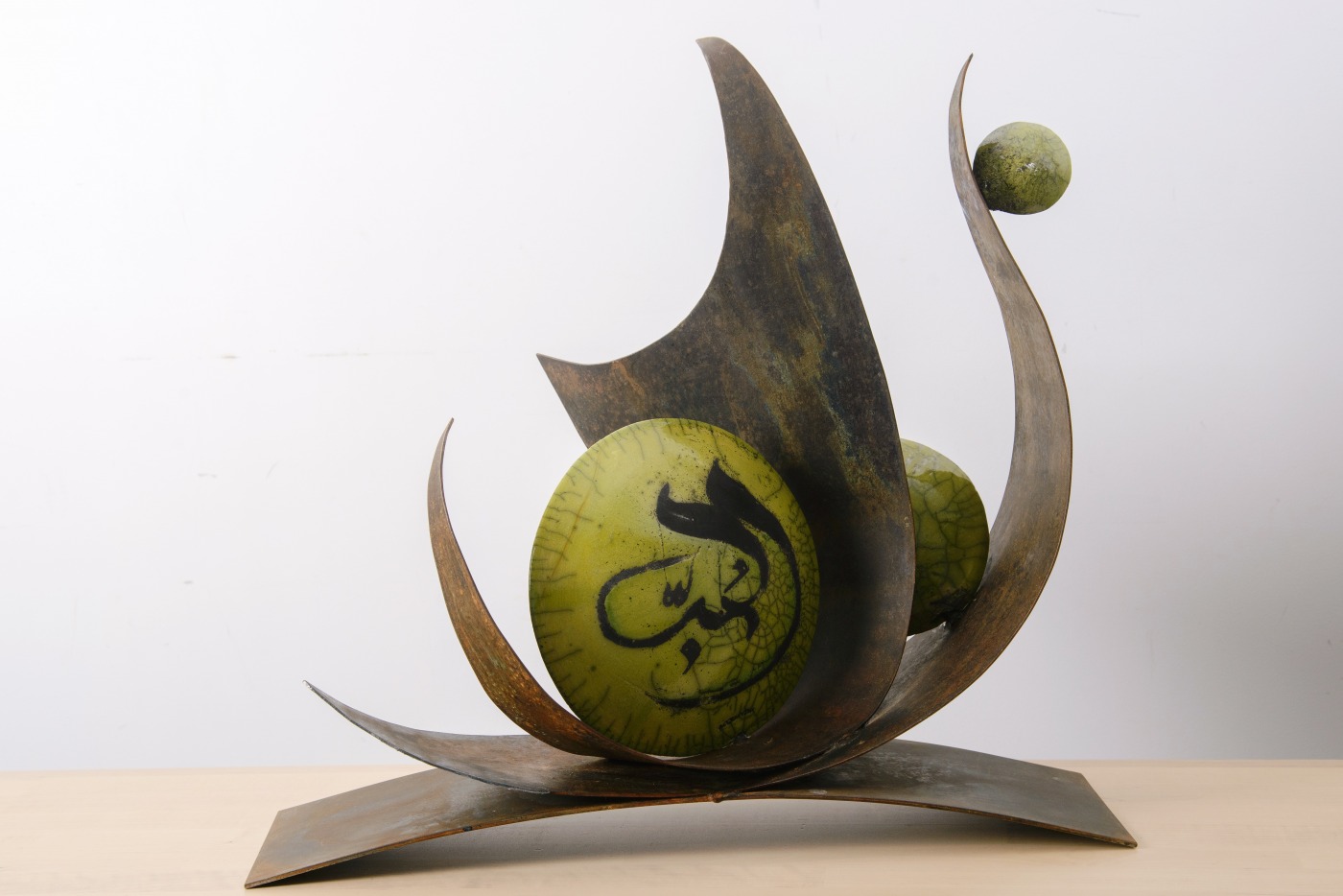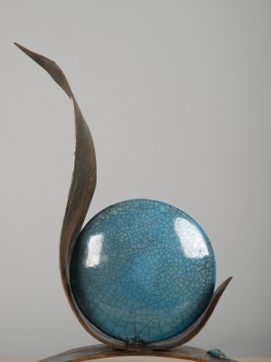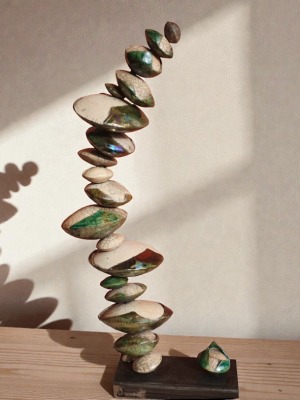 *Martine Acquaviva. Formée à l’École des Beaux-Arts de Paris, l’artiste se prend rapidement de passion pour la céramique qu’elle pratique dans son atelier à Dreux. Réalisées selon la technique du raku, mode de cuisson importé du Japon et utilisé essentiellement pour la création de bols pour la cérémonie du thé, ses pièces en terre cuite sont circulaires, forme sans début ni fin symbolisant ainsi l’infini. Martine les assemble en modules harmonieux dont l’équilibre tient à l’alternance des tailles de ces pièces et des couleurs. Ces modules sont inspirés des voyages qu’elle effectue, en Afrique notamment, où elle a eu l’occasion de travailler avec les potières du village de Kamsi, au Burkina Faso, mais aussi au Maroc, où elle est allée à la rencontre du calligraphe Sadik Haddari. Ainsi, au-delà-même de leur nature d’objet, les sculptures de l’artistes sont liées au travail de la terre et au partage de son savoir qu’elle prend plaisir à enseigner.